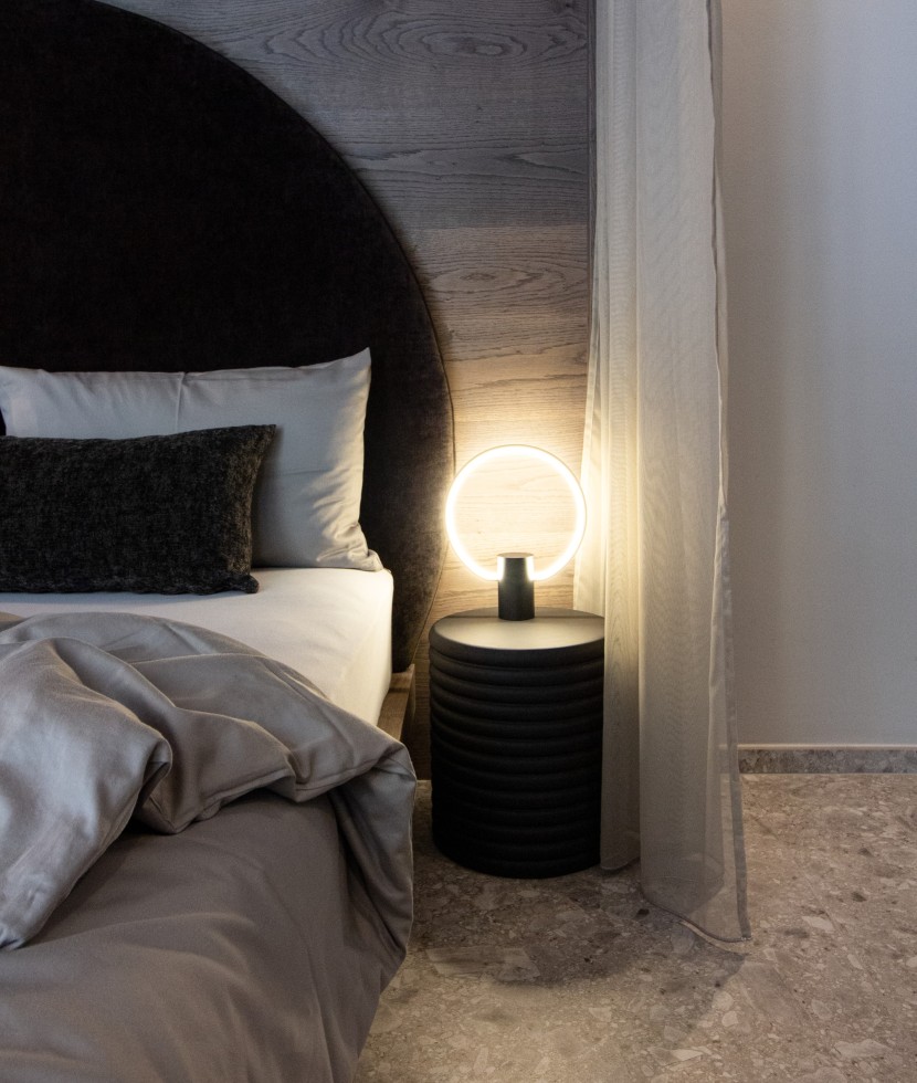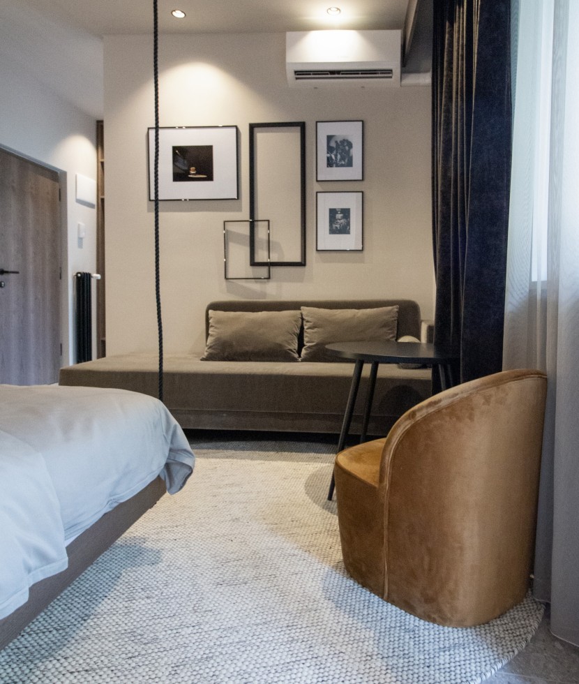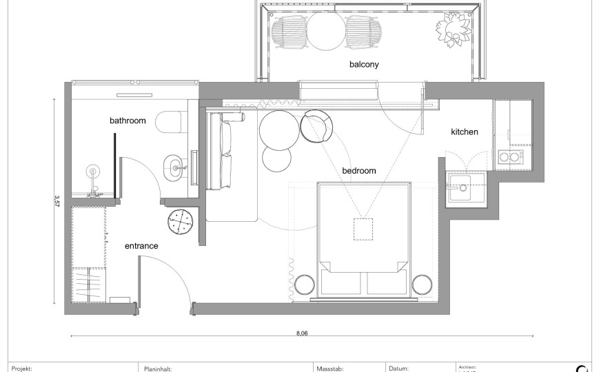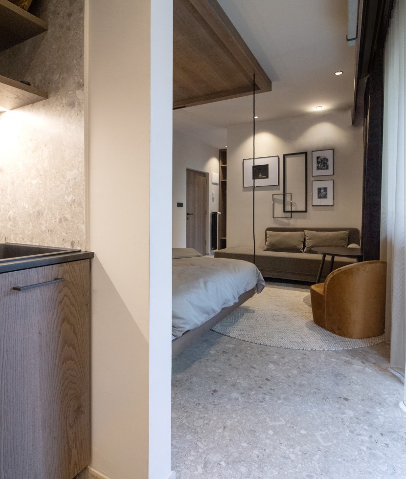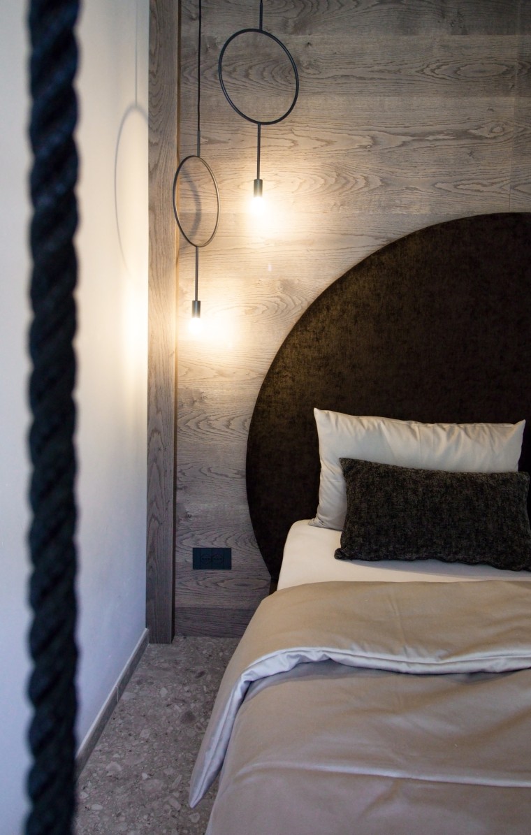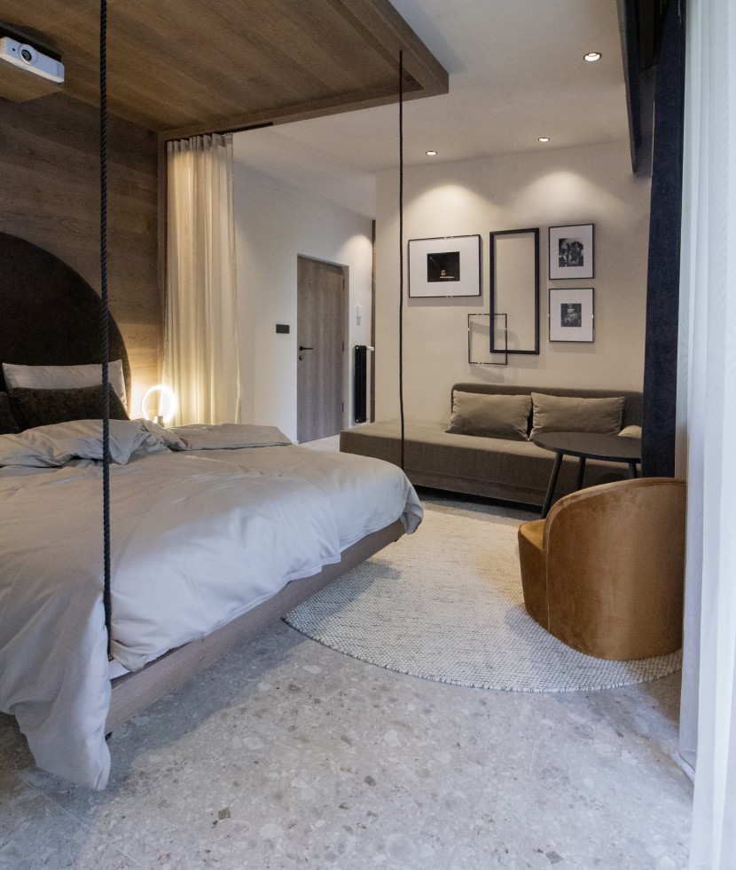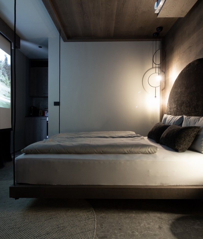 The almost exclusively black and white interior design is based on the concept that a room can serve as the stage for a story or a film scene. Only one piece of furniture is coloured and is reminiscent of the main protagonist of a scene. Each piece of furniture and the layout has been carefully selected and designed to best meet the needs of a short holiday stay.